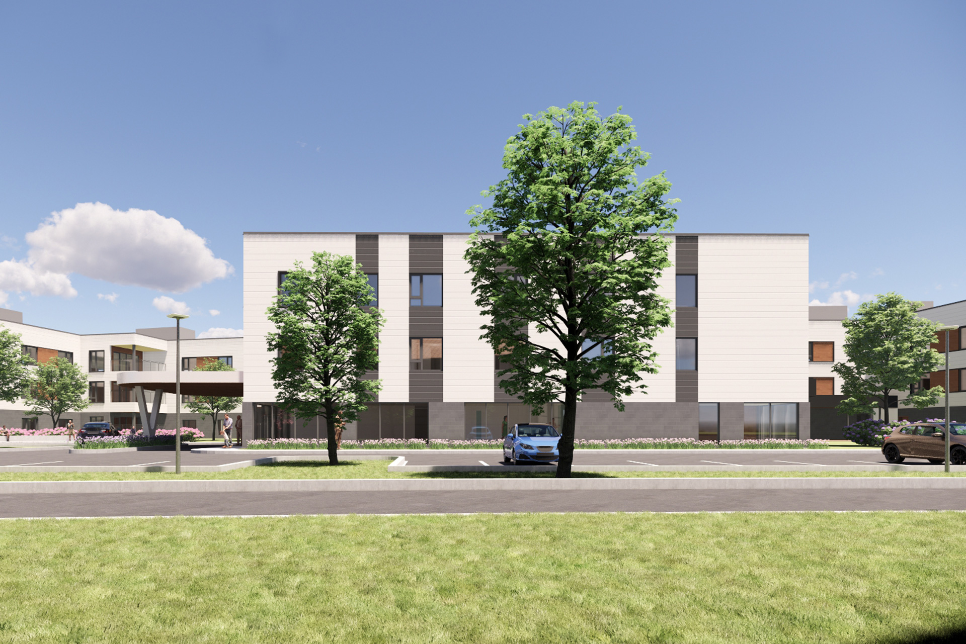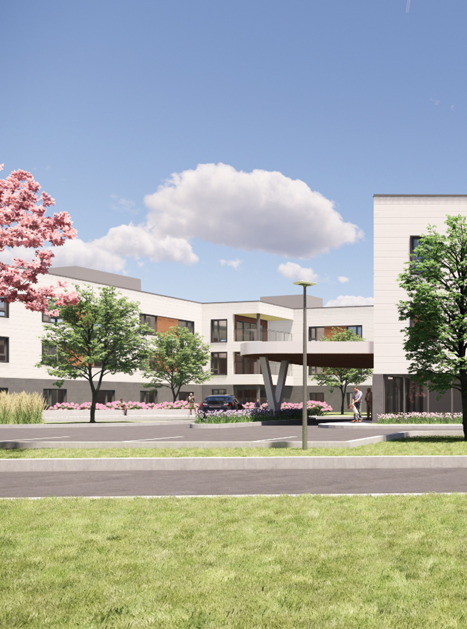 Lieu __________ Perth Client _______________________________ Arch Senior Care Co-Ownership Type de travaux réalisés ________ Architecture, Architecture de paysage et design d’intérieur Date ______ En cours Le projet prévoit la construction d’un établissement de soins de longue durée (CHSLD) de trois étages avec sous-sol, comprenant 160 lits et 69 cases de stationnement en surface. Le bâtiment, de forme en « C », sera implanté le long de la limite est du terrain et desservi par deux accès véhiculaires. L’aménagement inclut deux cours intérieures, dont un jardin thérapeutique, ainsi qu’une aire centrale de débarcadère assurant une circulation sécuritaire sur le site.