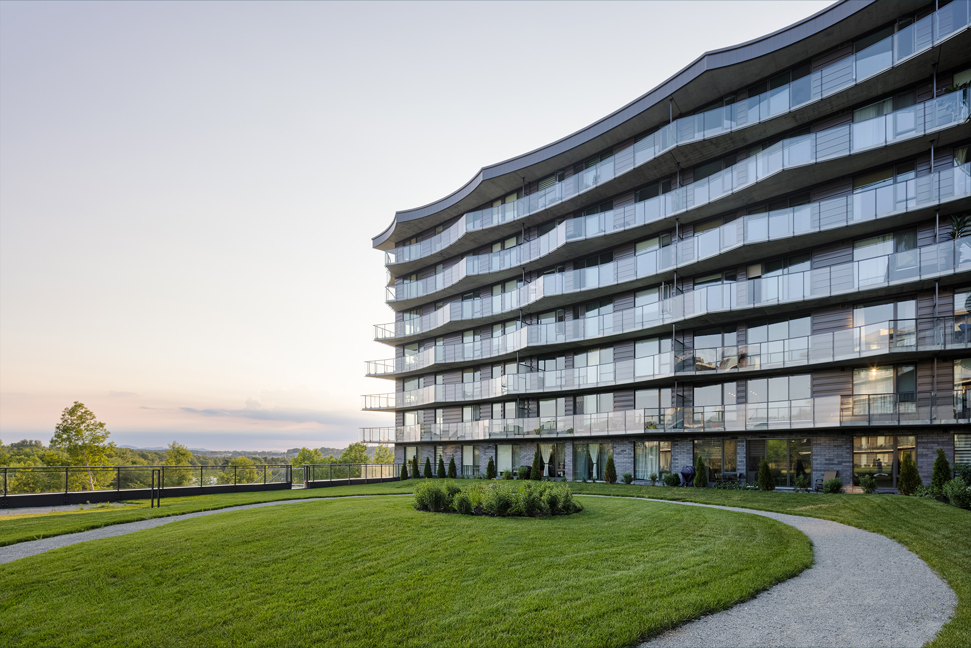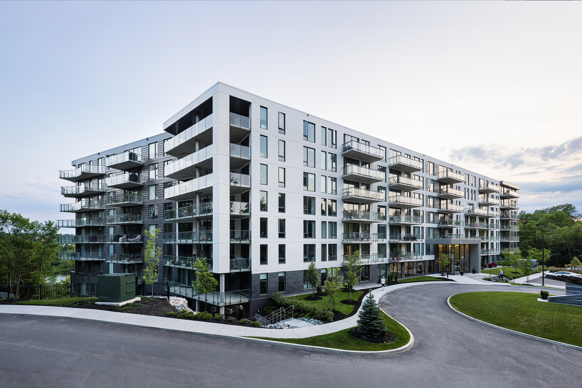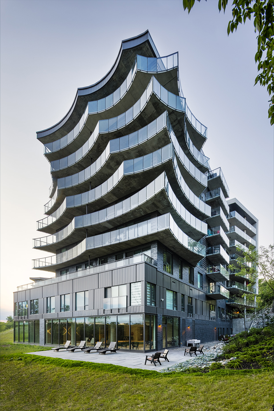 Humano est un projet de condos locatifs situé sur les berges de la rivière Magog à Sherbrooke. Inspirée de La Grande Vague de Kanagawa, son architecture aux formes ondulées et aux balcons généreux évoque le mouvement de l’eau tout en offrant ombrage et confort aux résidents. Le complexe compte 173 logements répartis sur sept étages, dont la forme en U et la fenestration abondante maximisent la lumière naturelle ainsi que les vues sur la rivière et le mont Orford, s’intégrant harmonieusement au tissu urbain à échelle humaine.