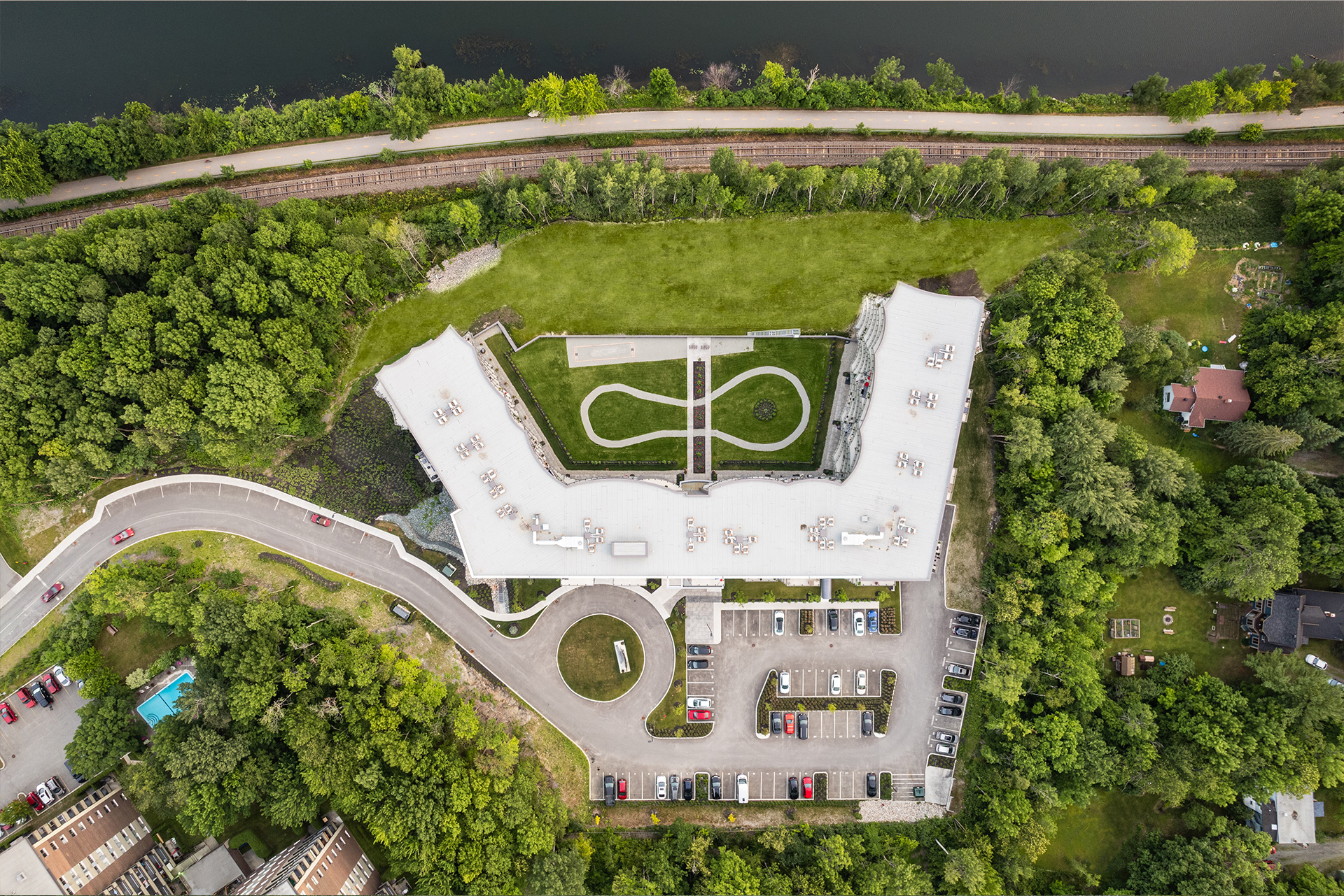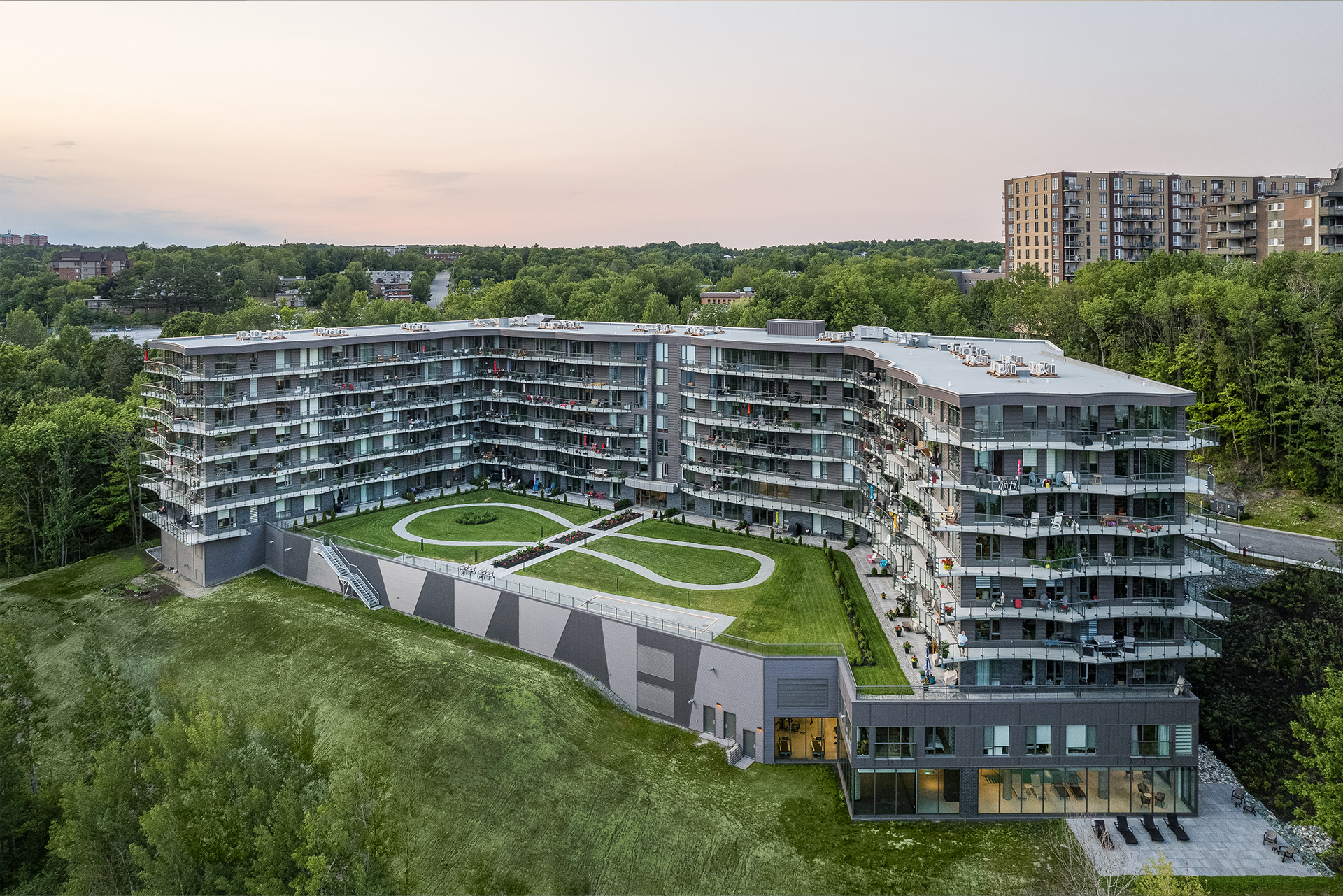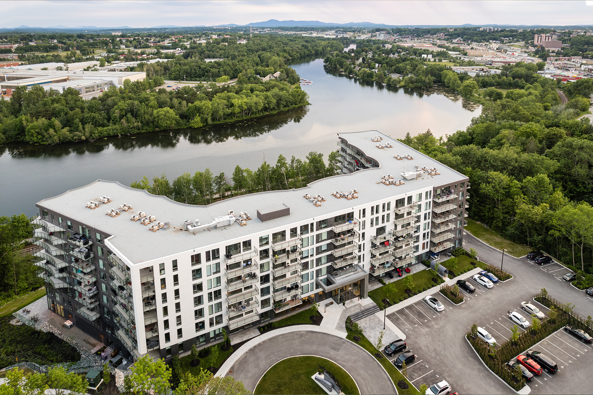 Humano est un projet de condos locatifs situé sur les berges de la rivière Magog à Sherbrooke. Inspirée de La Grande Vague de Kanagawa, son architecture aux formes ondulées et aux balcons généreux évoque le mouvement de l’eau tout en offrant ombrage et confort aux résidents. Le complexe compte 173 logements répartis sur sept étages, dont la forme en U et la fenestration abondante maximisent la lumière naturelle ainsi que les vues sur la rivière et le mont Orford, s’intégrant harmonieusement au tissu urbain à échelle humaine.